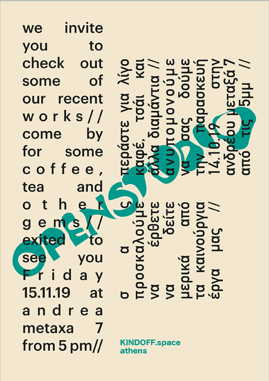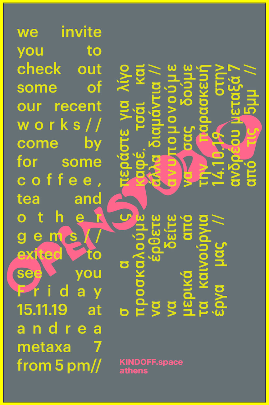 The kindoff.collective was the framework for an educational experiment at the Design Academy Eindhoven. Longing for inspirations and challenges of a new dynamic context we ventured to Athens where we created a collectively run design studio and gallery with bi-weekly exhibitions. Right in the centre of Exarchia, where political activism meets creativity and nightlife, we set up ourselves in an abandoned mansion. Over the cause of 6 months we organised 10 exhibitions, many workshops and residencies and countless meetings – full of love and struggle.
